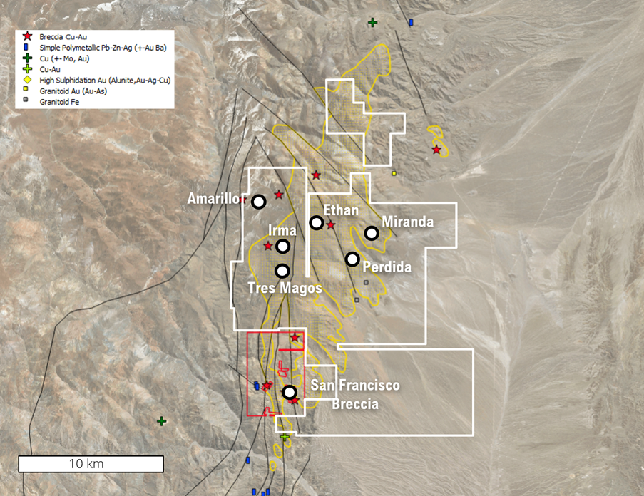 Drilling by the Company at the SFdLA Project has confirmed a significant high-grade tourmaline copper-gold-silver breccia pipe, while regional work has developed multiple targets with a multitude of mineralizing styles, not surprising given the robust geological setting. Detailed mapping and sampling is currently underway at high-priority drill targets, including several recently discovered intrusion-related gold systems: