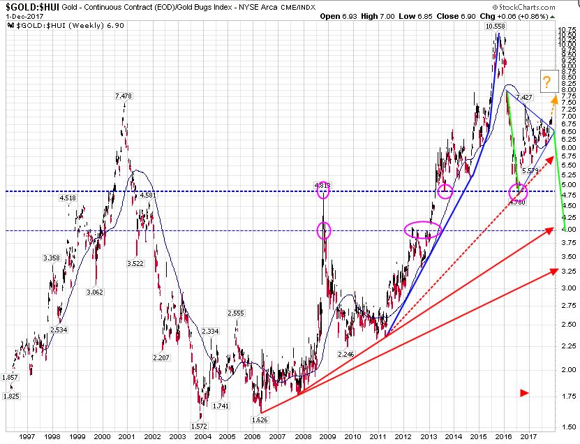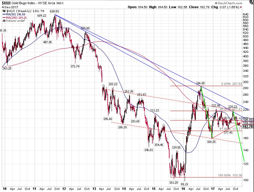 Und ziemlich uneindeutig, was man erwarten soll, allein aus dem Preischart des HUI.