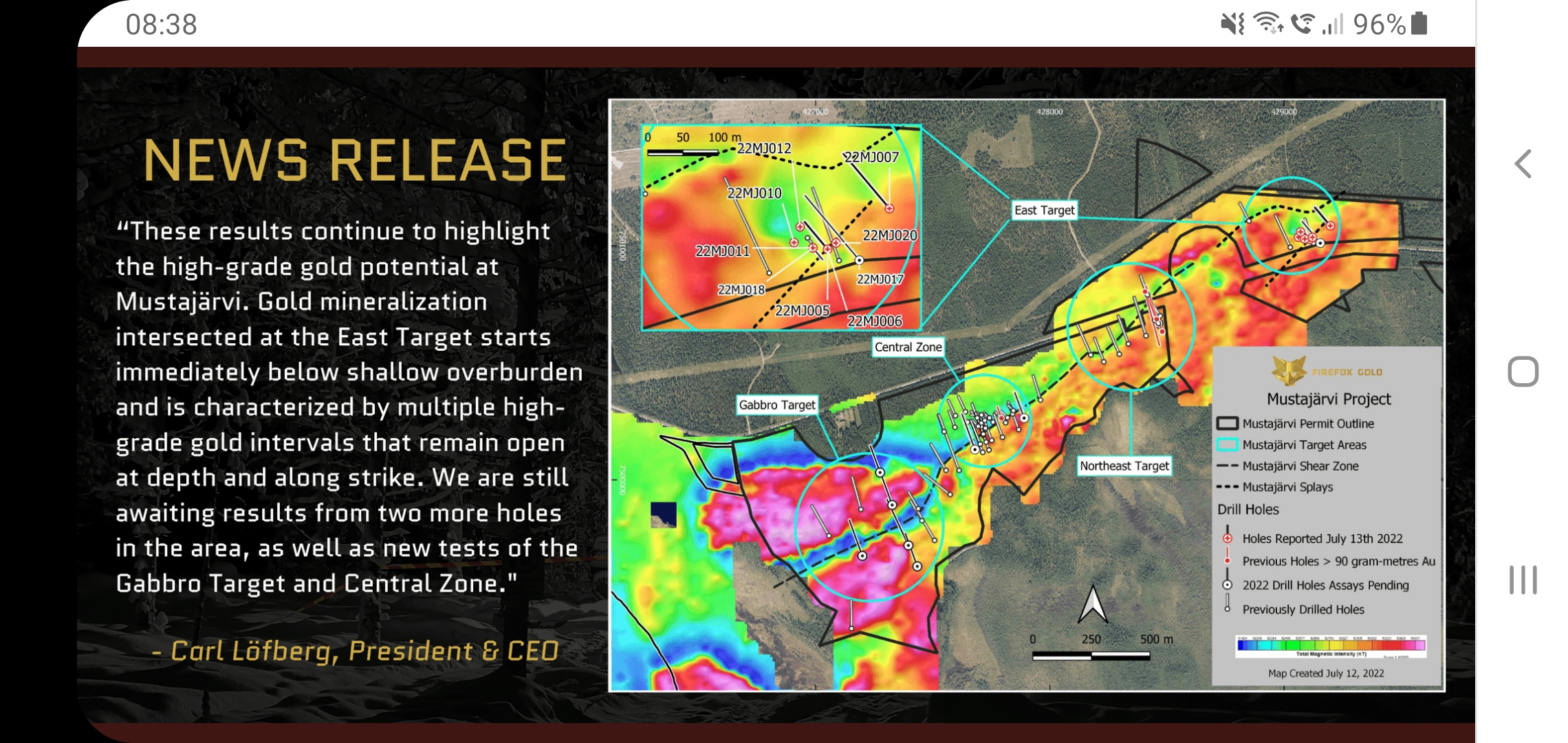 Zitat von Firefox GoldAlles anzeigenSODANKYLÄ, FINLAND – (July 13, 2022) – FireFox Gold Corp. (TSX.V: FFOX)(OTCQB: FFOXF)(“FireFox” or the “Company”) is excited to report additional results from its 2022 core drilling program at the Company’s 100%-held Mustajärvi Gold Project in Lapland, Finland. Four holes returned significant near-surface, high-grade gold mineralization, highlighted by hole 22MJ006 in the East Target that returned a 13.85-metre interval averaging 14.39 g/t gold. Expressed in terms of grade-thickness, this interval measures 199 gram-meters of gold, the strongest mineralized interval yet drilled at Mustajärvi (see Table 1 and Figure 1).
