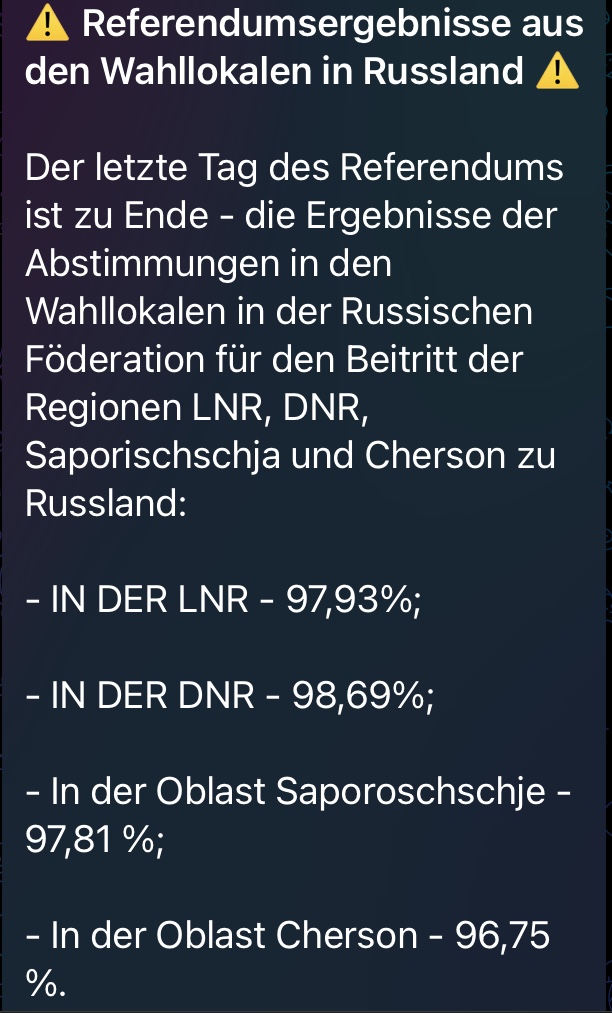 Wäre ich angesichts der vielen Geflohenen ja geneigt zu glauben wenn das Ergebnis bei 60% gelegen hätte, aber das... ich erinnere an die Proteste in Cherson; so weit ich weiß wurde da auch niemand in Folge der von uns unterscheidlich ausgelegten Ereignisse seit 2014 beschossen. Aber immerhin sinds in Cherson ja nachvollziehbare 1% weniger. Also bitte...