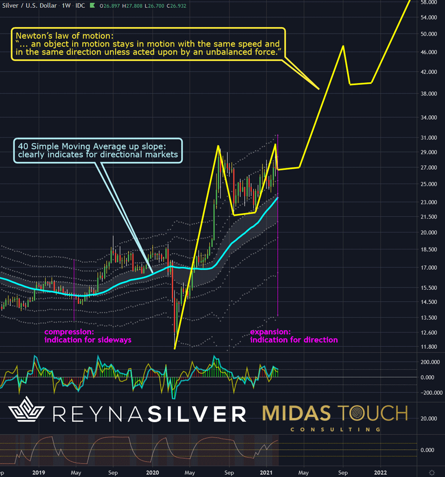 Silber genau umgekehrt steigt in kurzer Zeit enorm und korrigiert dann lange.