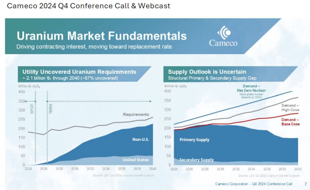 Der weltweite Bedarf der Reaktoren an Uran im Jahr 2023 wird auf etwa 65.650 tU geschätzt. Im Referenzszenario wird ein Anstieg auf fast 130.000 tU im Jahr 2040 erwartet, wobei der Bedarf im oberen Szenario bis zu diesem Zeitpunkt auf 184.300 tU und im unteren Szenario auf fast 87.000 tU ansteigen wird.