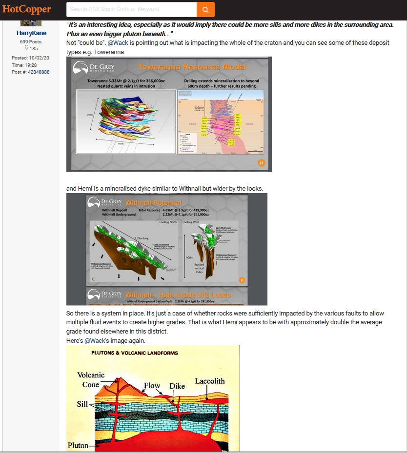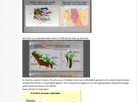Im Hotcopperforum vermutet jemand, die säulenartigen Vererzung seien Ausläufer eines Plutons. Einer sehr alten Magmablase, von der granithaltige Ausläufer in Richtung Oberfläche gepresst wurden. Conclusio: unter den zahlreichen in der Fläche verteilten Granitintrusionen,wie sie seitens der Geologen dort genannt werden, könnte ein riesiger Erzkörper in der Tiefe lagern, der der Ursprung der Einzelvorkommen ist und viiiel größer ist als selbige.