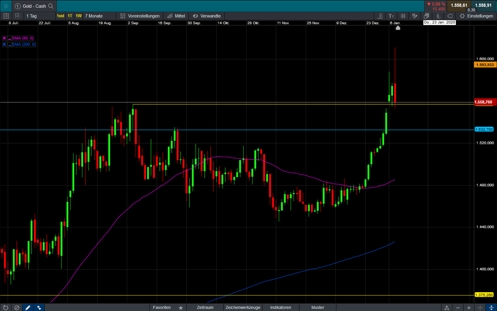 Wie es jetzt weitergeht? Aktuell haben wir ein Bearish Engulfing Pattern im D1 Chart. Nichts schönes. Wenn das auf Tagesschlussbasis so stehen bleibt, sind die Chancen trotz Unterstützungslinie und realisiertem Gap-Close m. E. etwas grösser, dass die 1550 nicht halten. Auf jeden Fall würde ich mit wilden Zukäufen und Umschichtungen zuwarten. (Die Charttechnik ist aber ohnehin zu relativieren, da der Markt aktuell besonders unter dem Stern des Golfkonfliktes steht).