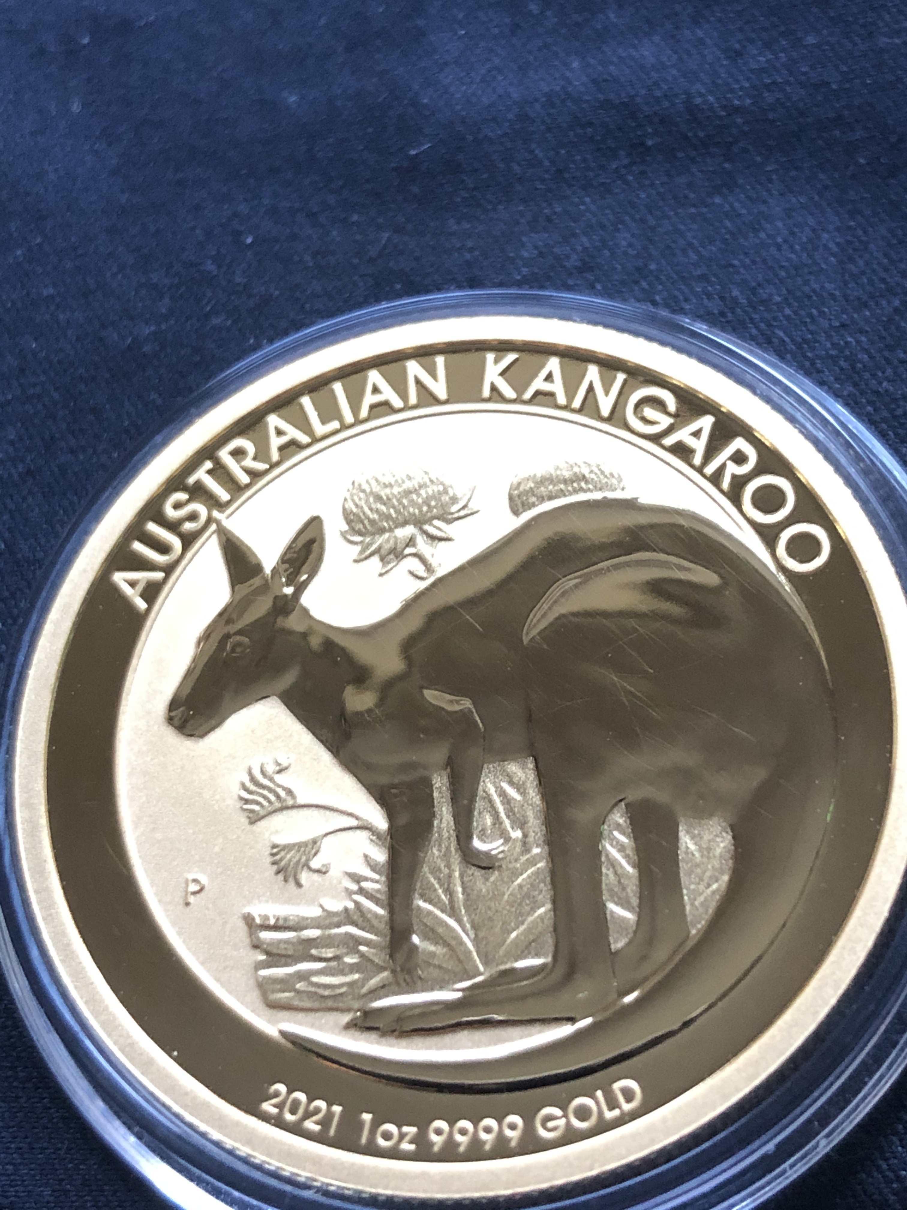 "Die 1 oz Gold, Känguru 2021 werden in der Prägequalität Stempelglanz ausgegeben. Geringfügige Kratzer sind durch den Ausstoß nach der Prägung bereits möglich, da die Münzen erst in einem Sammelbehälter fallen. Feine leichte Kratzer können daher bei diesen Münzen auftreten.