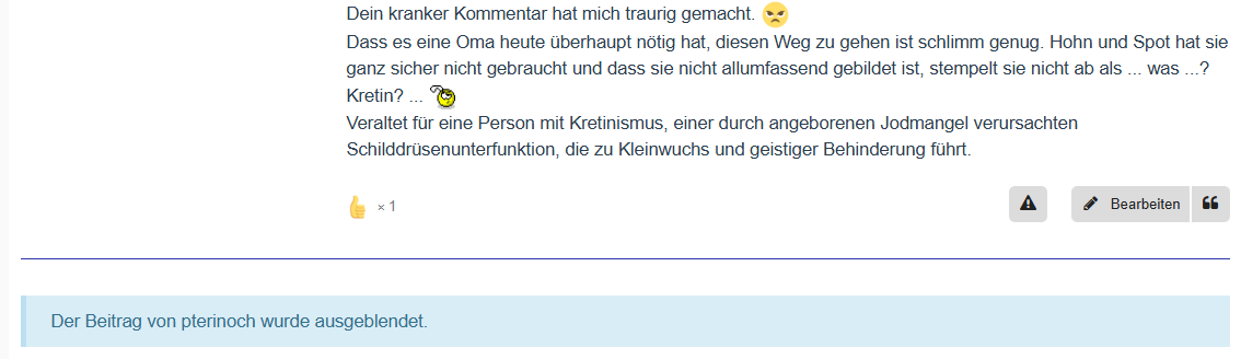 Dass es eine Oma heute überhaupt nötig hat, diesen Weg zu gehen ist schlimm genug. Hohn und Spot hat sie ganz sicher nicht gebraucht und dass sie nicht allumfassend gebildet ist, stempelt sie nicht ab als ... was ...? Kretin? ...