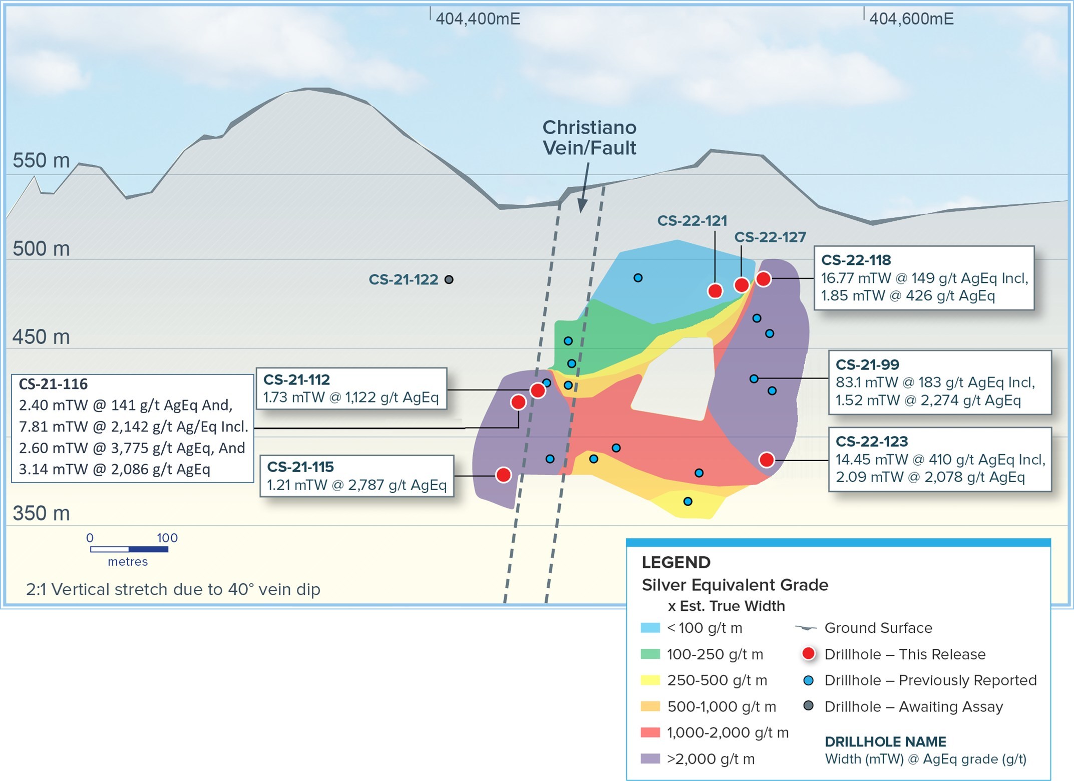 - CS-21-116 ergab 1.559 Gramm pro Tonne (g/t) Silber und 7,29 g/t Gold (2.142 g/t Silberäquivalent (AgEq)) auf 7,81 Metern tatsächlicher Mächtigkeit (mTW), einschließlich eines Unterabschnitts mit einem Gehalt von 2.728 g/t Silber und 13,10 g/t Gold (3.775 g/t AgEq) auf 2,60 mTW
