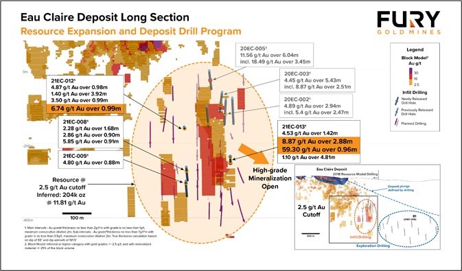 Bohrloch MIC-010 wurde 25 m neigungsabwärts von MIC-009 gebohrt und durchschnitt eine Kobalt-Nickel-Mineralisierung mit einem Gehalt von 0,22 % Co und 0,33 % Ni auf 22,0 m von 61,5 bis 83,5 m, einschließlich eines Unterabschnitts mit einer hochgradigen Mineralisierung mit einem Gehalt von 2,02 % Co und 2,70 % Ni auf 2,0 m von 81,0 bis 83,0 Metern. Die hochgradige Mineralisierung bleibt in der Tiefe auf Abschnitt 23+75N offen.