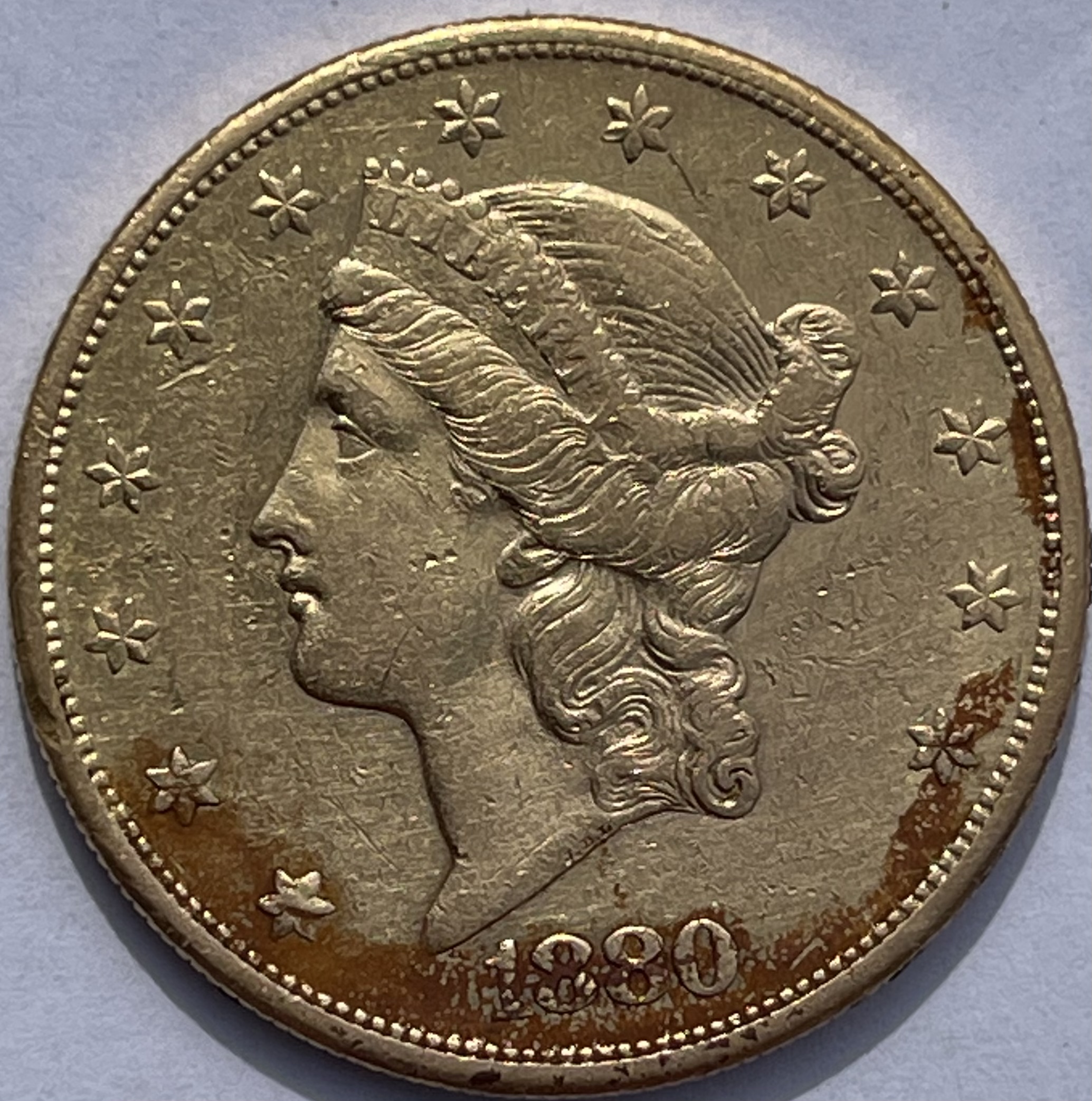 Neuestes Sorgenkind ist die zweite Münze, eine Double Eagle Liberty aus 1880. Hier nagt der Zahn der Zeit schon deutlich sichtbarer.