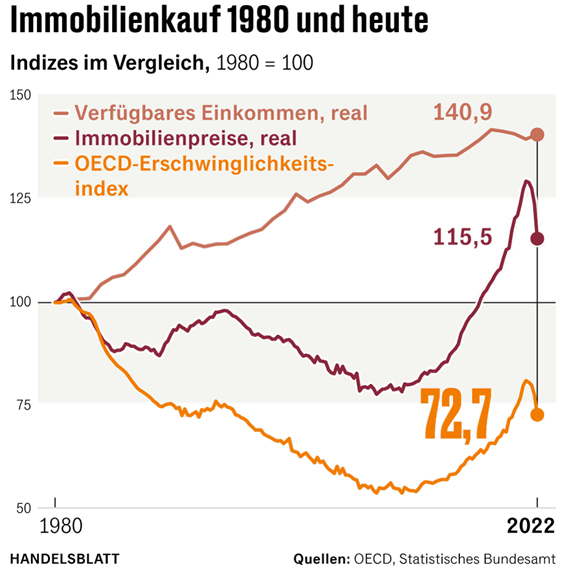 Nein, stimmt so nicht. Früher waren Immobilien in Deutschland kaufkraftbereinigt deutlich teurer als heute. Seit 1980 haben sie real, also nach Inflation betrachtet, um gerade mal 15,5 Prozent im Preis zugelegt. Im gleichen Zeitraum stiegen die verfügbaren Realeinkommen jedoch um 40,9 Prozent. Die Industriestaatenorganisation OECD errechnet aus beiden Größen einen Erschwinglichkeitsindex für Immobilien. Der ist seit 1980 deutlich gesunken, wie unsere Grafik zeigt.