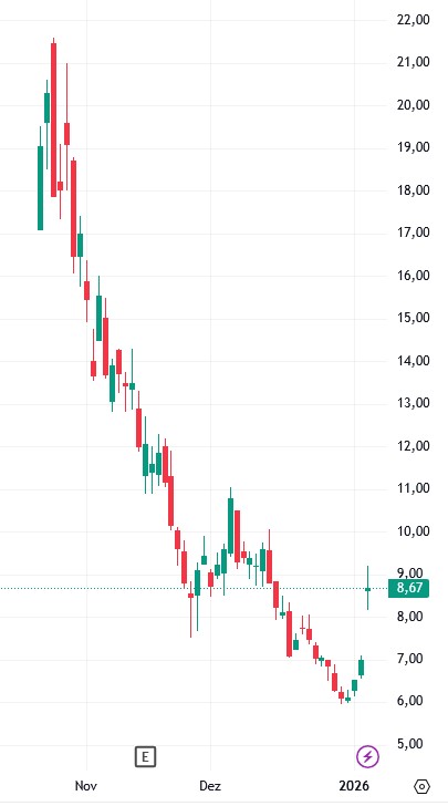 Wenn ich zum Vergleich eine NuScale oder Oklo ansehe, sieht man, dass die ebenfalls zu Beginn stark gefallen sind und anschließend erst den Turbo gestartet haben. Wenn ich vom Hoch bei 31,50 USD ausgehe, hätten wir zum Tief vom 25.11. bei 7,65 USD bereits über 75% korrigiert.