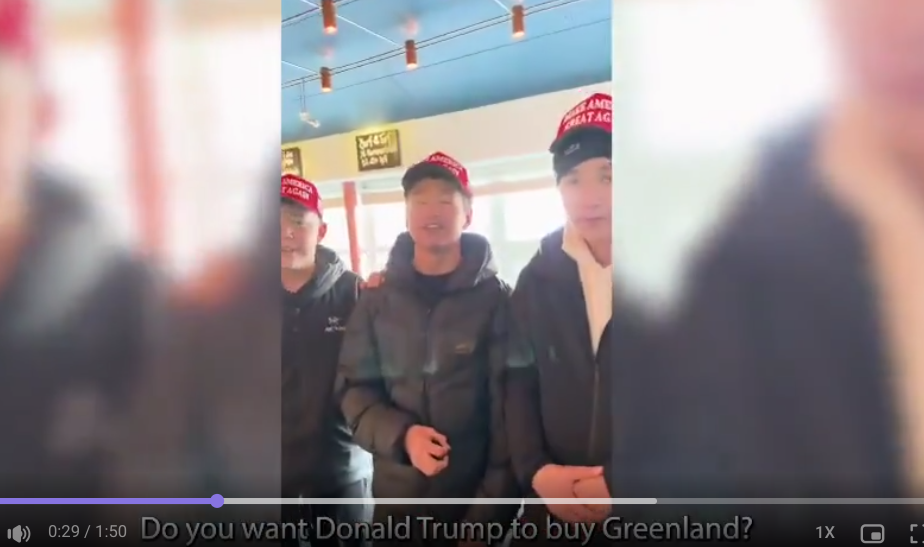 Alles anzeigenWenn das Video nicht gestellt ist und das die tatsächliche Meinung der Inuit zeigt, dann könnte Trumps Plan aufgehen. Das würde heißen, daß sie sich unter der dänischen bzw. europäischen Decke nicht wohl fühlen und raus wollen, was auch in dem Clip gesagt wird