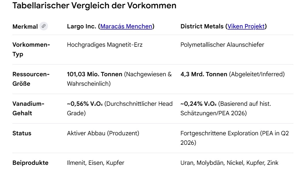 Merkmal Largo Inc. (Maracás Menchen)District Metals (Viken Projekt)Vorkommen-TypHochgradiges Magnetit-ErzPolymetallischer AlaunschieferRessourcen-Größe101,03 Mio. Tonnen (Nachgewiesen & Wahrscheinlich)4,3 Mrd. Tonnen (Abgeleitet/Inferred)Vanadium-Gehalt~0,56% V₂O₅ (Durchschnittlicher Head Grade)~0,24% V₂O₅ (Basierend auf hist. Schätzungen/PEA 2026)StatusAktiver Abbau (Produzent)Fortgeschrittene Exploration (PEA in Q2 2026)BeiprodukteIlmenit, Eisen, KupferUran, Molybdän, Nickel, Kupfer, Zink