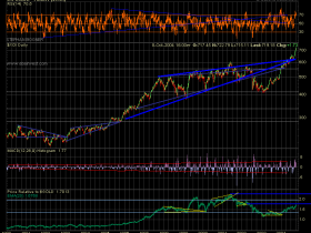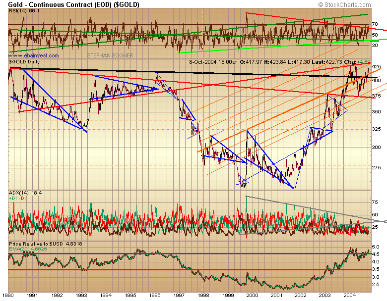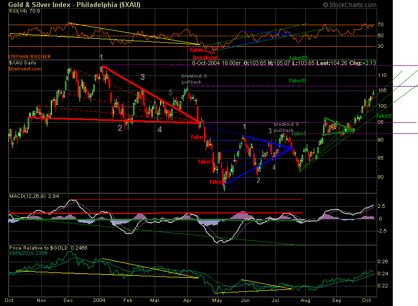 PS: Gold relativ zum USD (unten im Chart) befindet sich bereits im Breakout - ein Pullback zurueck zur Spitze koennte nun erfolgen bevor das 3eck nach oben thrustet.