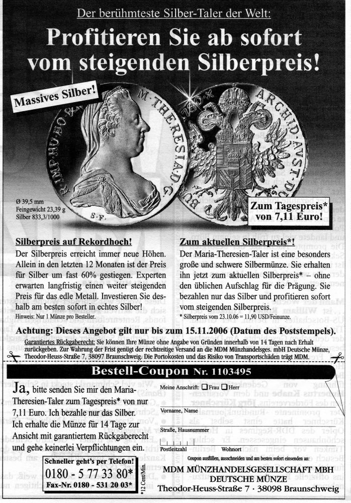 In der "BamS" war diesen Sonntag mal wieder ein Angebot von MDM drinn. Vielleicht ganz interessant, auch wenn es doch recht wenig Silber ist
