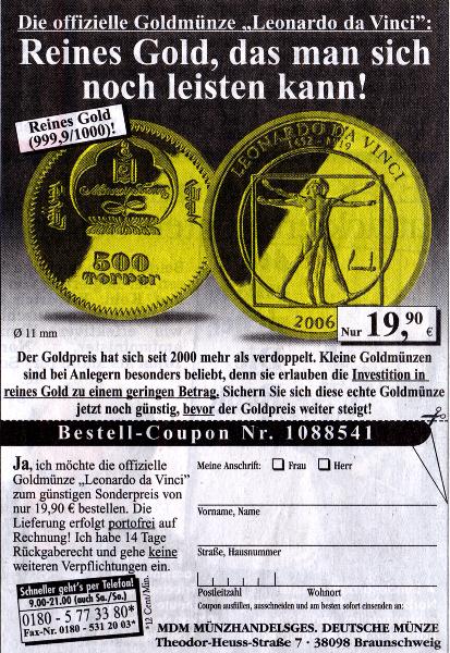 hab mal wieder ein MDM-Coupon für eine Goldmünze gefunden. Nun hat MDM allerdings keine Angabe zum Gewicht gemacht