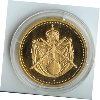 nein, es ist keine jahreszahl oder sonstiges zu finden! ich hab auch mal in einem anderen forum nachgefragt und da hat es geheißen, dass es eine goldmedaille aus russland sein könnte, wobei sie sich da auch nicht sicher waren. wobei ich nicht weis, ob es wirklich gold ist...