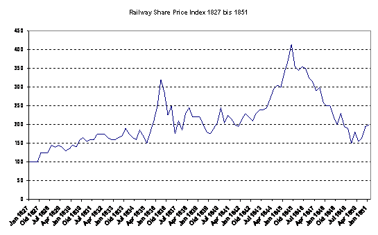 die erste findet sich in den 1830er jahren in england. objekt der begierde sind britische und deutsche eisenbahnaktien. der britische railway share price index stieg zwischen 1827 und 1836 von 100 auf 320 punkte, brach dann ein auf ca. 170 punkte um dann zu eine 'echobubble' anzusetzen, die ihn sogar auf ca. 420 punkte hoch trieb (um dann auf 150 abzustürzen) (bild im anhang). in so einer könnten wir uns aktuell befinden.