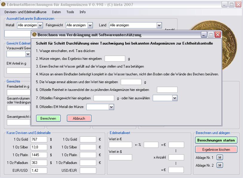 Entweder kann eine Anlagemünze auf ihre "Echtheit" überprüft werden (es wird nach Eingabe aller relevanten Werte die Dichte vom Fremdmetall berechnet und kann damit zur Überprüfung eingesetzt werden) oder einfach mit der Tauchwiegung ein unbekanntes Stück Metall auf die Dichte hin untersucht werden.