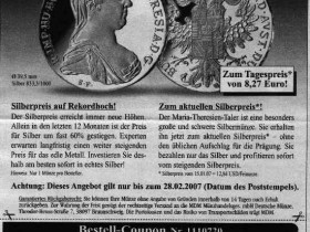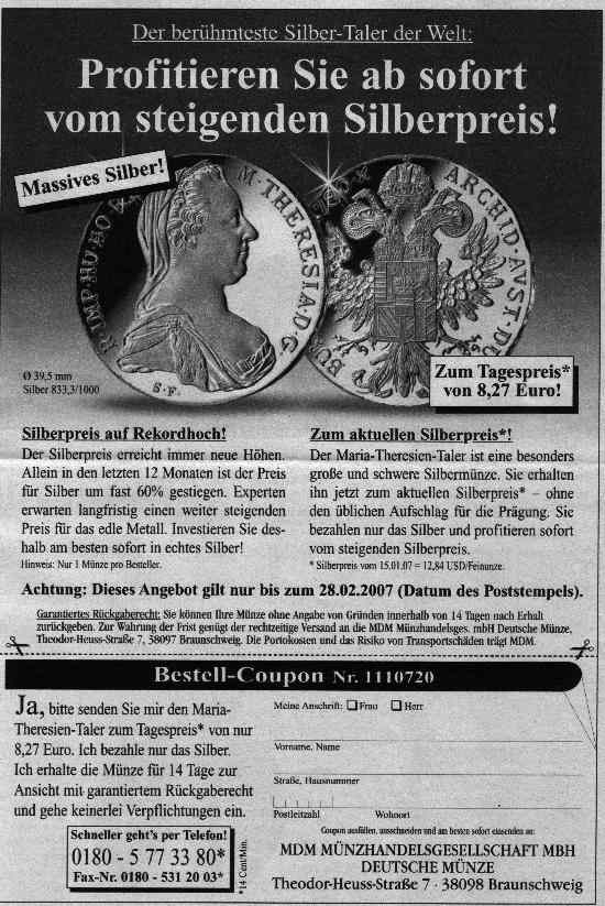 In meiner TV-Zeitung (TVpicolino) ihabe ich wieder ein Angebot von MDM entdeckt und zwar wieder ein Teresien Taler. Dieses Mal für 8,27€ incl. Versand.