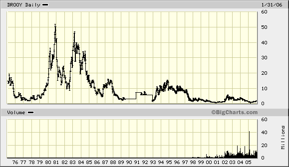 In 9 years of history DROOY only delivered one profitable year, which was 2003. Analysts expect the company to be profitable in 2006 and beyond, but don't they always expect that? [Blockierte Grafik: http://www.smiliemania.de/smilie132/00000285.gif]