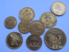 Die anderen offensichtlich an österreichische historische Medaillen angelehnten Stücke habe ich persönlich noch nicht "befummeln" können, sind jedoch bei eBay schonmal aufgefallen. Es gibt welche in Gold, jedoch gibt es da auf jeden Fall auch motivähnliche vergoldete Stücke aus allerlei Materialien, weswegen ich da lieber die Finger fernhalte.