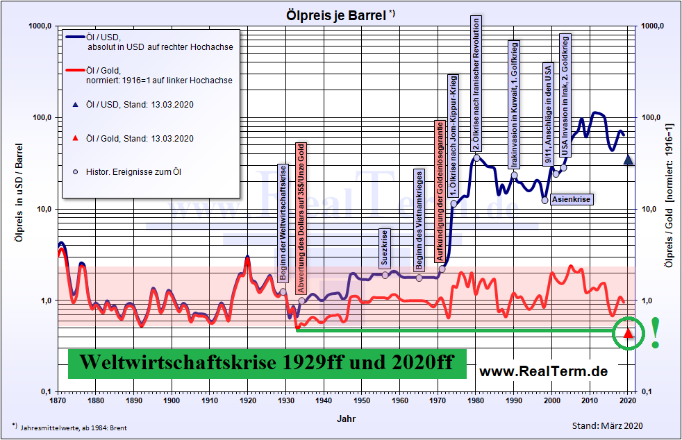 DAX/Gold unter 2, ist das möglich? Sehr gut sogar. Tatsächlich wirkt der Corona-Virus hier einerseits als Brandbeschleuniger und andererseits als Verstärker. Wir haben noch lange, lange nicht das Ende dieser Baisse gesehen. Ja, es wird monatelange Zwischenerholungen geben. Die Blaupause heißt "1929" nicht "1987". Das wird kein "V"-Erholung wie 1987. Die Wirtschaft wird völlig zerstört werden und wird viele, viele Jahre brauchen, sich zu erholen. Es wird eine sehr, sehr breites "U" werden. Von daher ist die Aufgabe tatsächlich möglichst wenig zu verlieren, gewinnen kann man bei dem Spiel praktisch nicht. Sozialismus, Diktatur und Krieg warten auf uns. Was will man gewinnen? Vielleicht sind wir am Ende froh, mit dem Leben davon zu kommen. Das sind tragische Aussichten. Gott sei Dank aber hat das Volk einen Sündenbock, den angeblich Schuldigen, das Corona-Virus. Das Volk braucht Schuldige, wenn es dem Volk schlecht geht. Vielleicht ist das Virus aus dieser Sicht sogar die Rettung. Es kann als Sündenbock für das Volk herhalten und die Wut entlädt sich nicht an anderer Stelle. Wer nimmt es einfach so hin, wenn sich Lebensersparnisse in Luft auflösen?