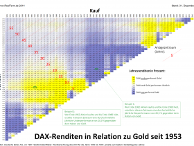 Das Renditedreieck DAX versus Gold. Demnach hat der DAX 2014 Gold um 9,4% underperformt. Immerhin. Ein Anfang.