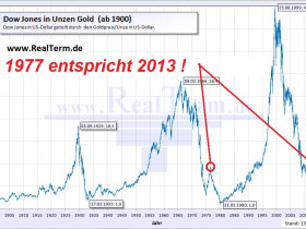 Nun, in der DAX/Gold-Graphik entspricht das Jahr 2007 dem Jahr 1971 (vgl. Legende). Es liegt also ein Zyklus von 36 Jahren vor. Also entspricht das Jahr 2013 etwa 1977. Und dieses verrückte Jahr 1977 schauen wir uns jetzt mal im zweiten Chart Dow Jones/Gold an.