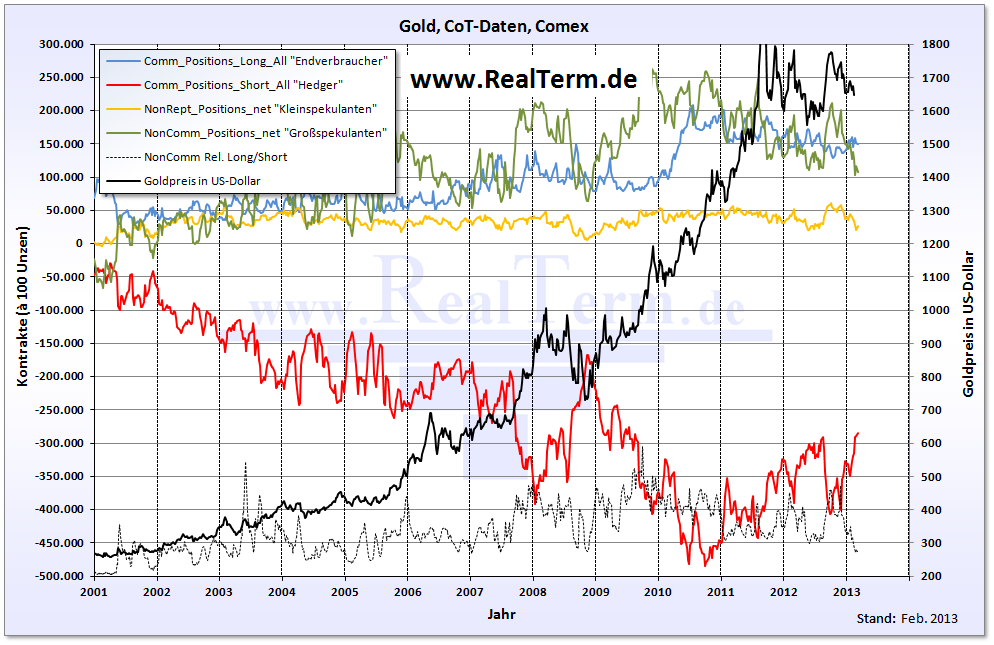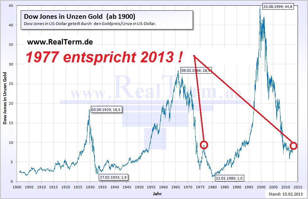 Nun, ich denke die Aktienmärkte sind zu stark aufgeblasen, überhitzt, sie werden zu fallen beginnen ( Sell in May??? ), Gold wird ggf. sogar anfänglich weiter mitfallen, sich dann aber halten und schlussendlich-aufgrund von Krisensymptomen und Gelddruckorgien seinen Weg nach Norden allmählich wieder aufnehmen. DAX/Gold wird am Ende dieser etwa dreijährigen Phase in 2015 bei etwa 5,0 liegen.