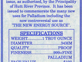 Der Palladiumsammelermarkt schläf auch - eine schöne Hutt River "Muenze" wurde gestern fuer ca. $US 680 verkauf, meine hat ca. $US1000 gekostet. Ich habe auch fast alle Gold und Palladiummuenzen, die ich sammeln will - suche nur noch die 98 Portuguese Muenze "Mozambique" ...........