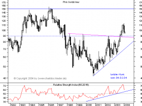 Der Aktienkurs Placer Dome entwickelte sich nach dem Ausbruch aus der unteren S-K-S Formation hervorragend. Auch wenn hier bald eine Kurskorrektur folgen könnte, so bleibt das langfristige Bild positiv, solange die Marke von 19 U$ nicht wieder unterschritten wird.