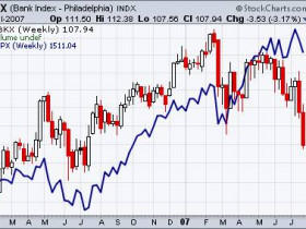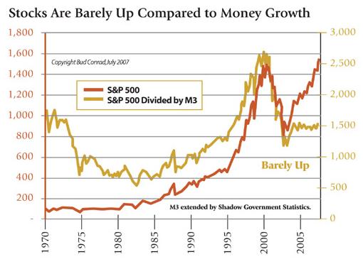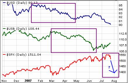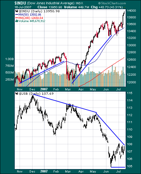 Bonds made a high at 115 in late 2006 and have been trending lower ever since. The stock market likewise has been unfazed (except for a brief hiccup in March) and has been boldly moving higher.