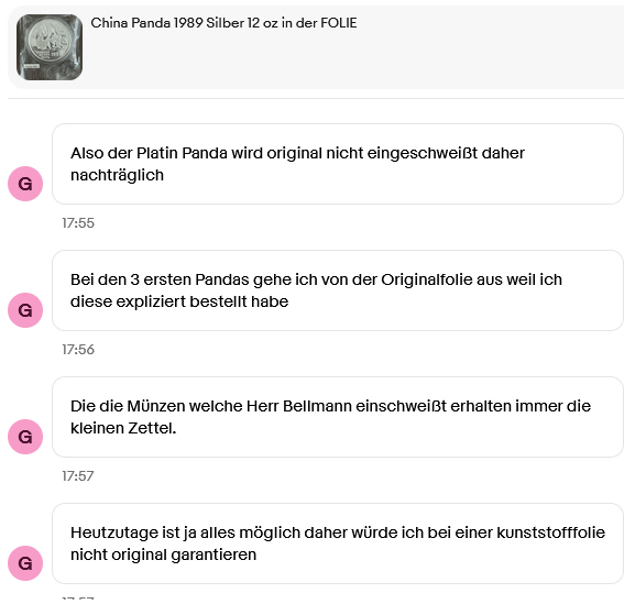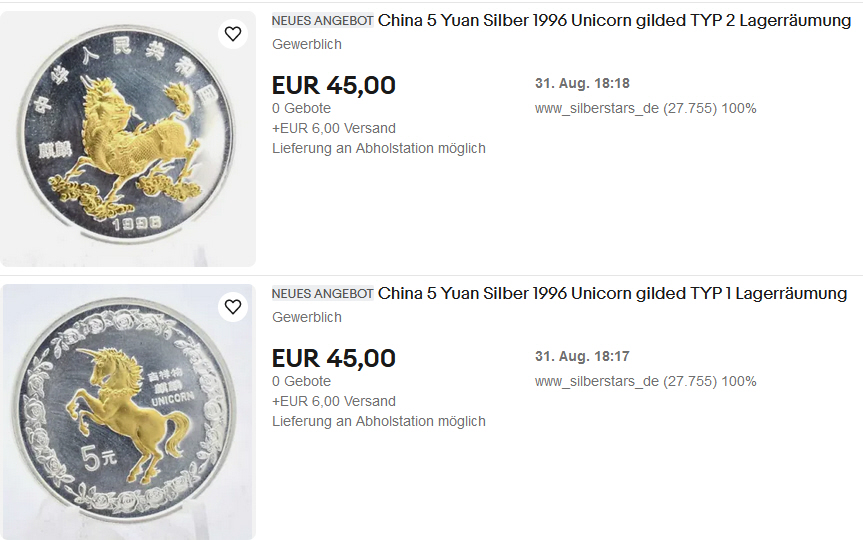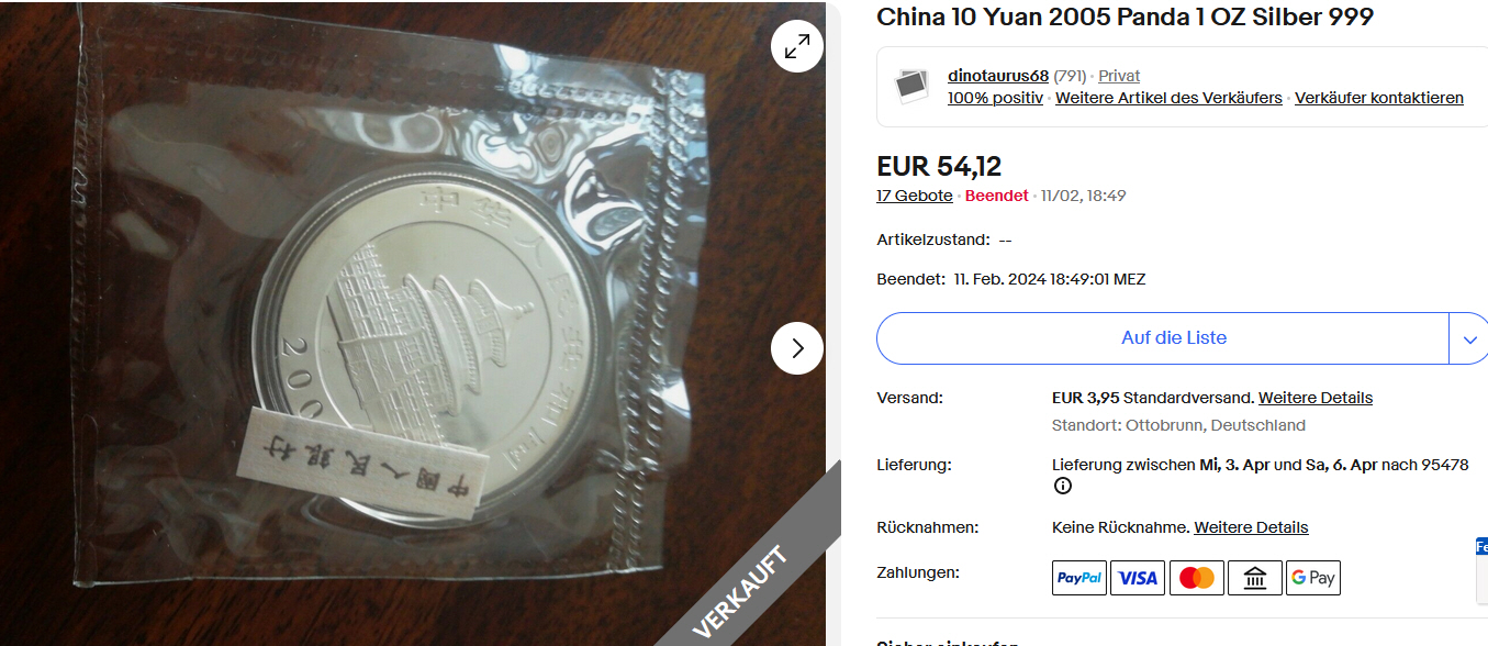 ZitatUnd wie Bullionente schon genau richtig festgestellt hat, Teutoburger lässt über Zeitaccounts hochbieten (das ist natürlich nur eine ungerechtfertigte Unterstellung [Blockierte Grafik: https://forum.silber.de/images/smilies/smilie_07.gif] ), aber niemand der chin. Münzen sammelt hat 100% Bietaktivität bei nur einem Käufer...., erkennt man auch daran, dass immer wieder die gleichen Münzen zum Verkauf erscheinen, bis sie dann -nach dem 2 und 3 Durchlauf- tatsächlich verkauft werden.
