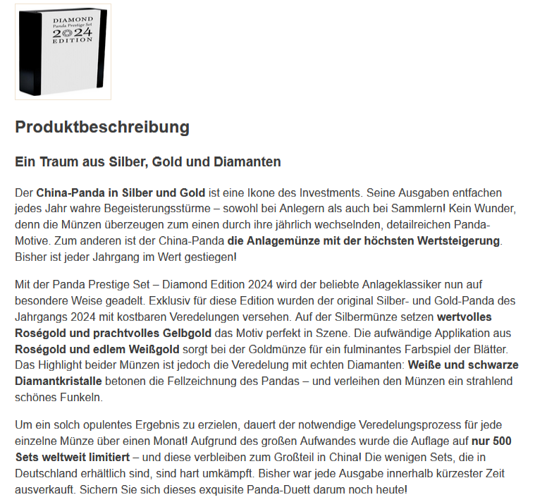 Die wenigen Sets, die in Deutschland erhältlich sind, sind hart umkämpft. Bisher war jede Ausgabe innerhalb kürzester Zeit ausverkauft. Sichern Sie sich dieses exquisite Panda-Duett darum noch heute!