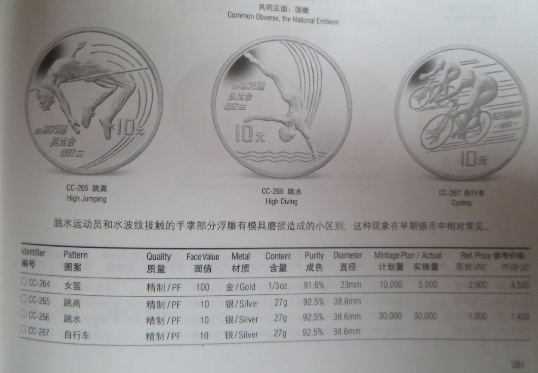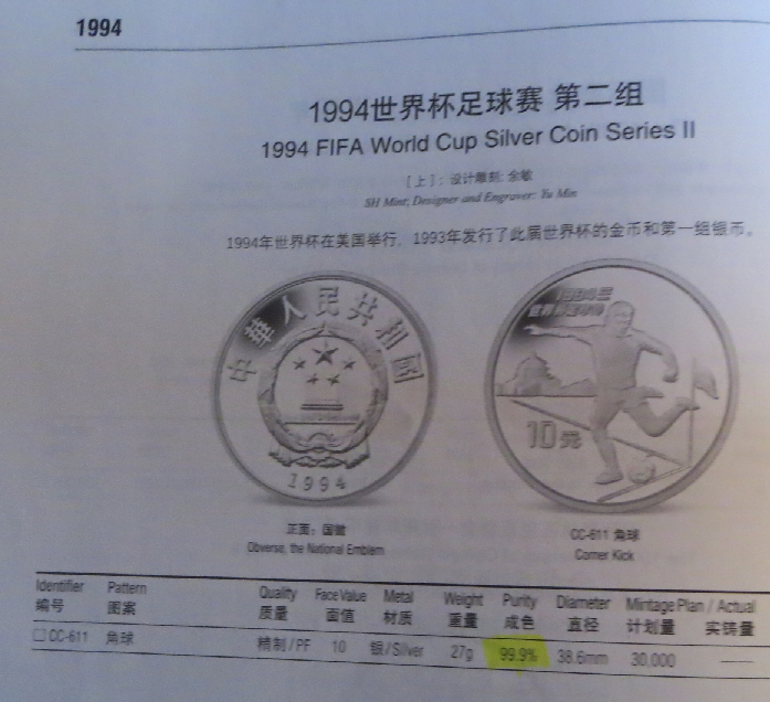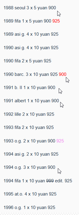 Habe die abweichenden Infos oben in rot (sowohl älterer Katalog als auch yjzx) eingetragen, im älteren Katalog gibt es noch eine Abweichung (in pink), gehe da allerdings mit yjzx, da die Olympiamünzen aus 1994 auch 900 er sind und man die fünf Münzen auch als einen Satz betrachten kann