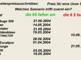 Der jenige, der am genauesten den Tag vorher sagt, an dem wir die 8 $ je Unze erreichen, Gewinnt 5 Unzen Silber!