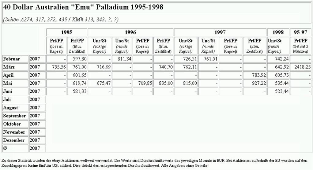 Ich werde aber zur Zeit das Gefühl einfach nicht los, dass die Pd-Emus eine Renaissance erleben. Dies ist nicht zuletzt an der Nachprägung der Ausgabe 1998 zu Testzwecken, die nicht nur hier im Forum für Diskussionen geführt hat, sondern auch das "große" Auftreten dieser Ausgabe in ebay. Somit wurde die Pd-Emu-Serie wieder ein wenig in den Fokus der Sammler (und vielleicht auch Investoren) gerückt. Ein weiterer Indiz, dass Interesse an diesen Münzen besteht liegt daran, dass ich in der letzten Woche sehr viele Anfragen bzgl. der Pd-Emu-Ausgaben auf Grund meines Projektes erhalten habe.