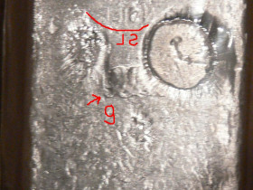 - Der Degussa Abdruck: Haltet am besten einen Degussa-Barren neben das Foto, das hilft erheblich bei der Wiedererkennung. Am besten erkennt man "SILB" aus "FEINSILBER" - das "S" und das "L" habe ich DARUNTER noch mal nachgezeichnet. Darüber sieht man ein "U" und ein "S" vom Degussa Schriftzug. Zudem noch Nullen von den "1000g" (s.u., habe zwei Nullen DARÜBER nachgezogen).