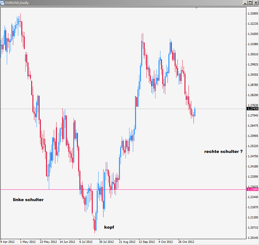 meiner meinung nach sehen wir bei eur/usd eine verkehrte SKS situation, wir müssen halt eine verlängerte schulter noch machen.......folge dessen müsste die rechte schulter höher als die linke sein, also irgendwo kurz unter 1,25......