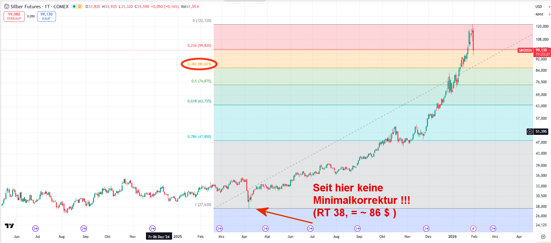 ...aktuell aber noch in einer 'anderen Liga' als Gold. Hier ist aktuell erst eine 'Minimalkorrektur (RT 38) abgearbeitet. Somit ist zunächst weiteres Korrekturpotential vorhanden. Im worst case ist der korrektive Aufwärtstrend der letzten Tage eine Bärenflagge auf Halbmast.