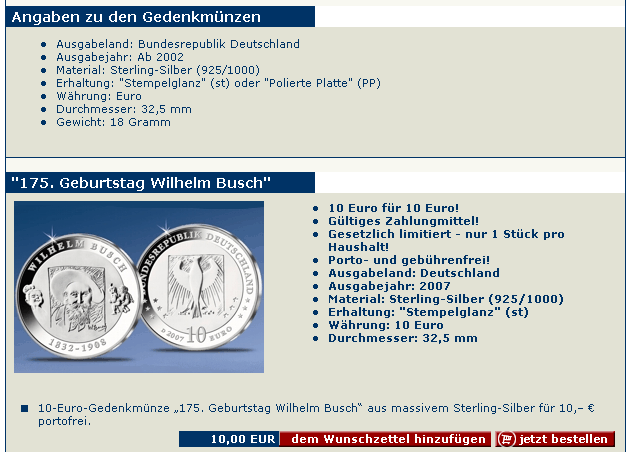 Es klingt wie ein Witz und ist wahrscheinlich auch einer, dennoch war ich über diese Formulierung auf der Webseite von MDM (Bestellung Silberzehner "Wilhelm Busch") sehr erstaunt: