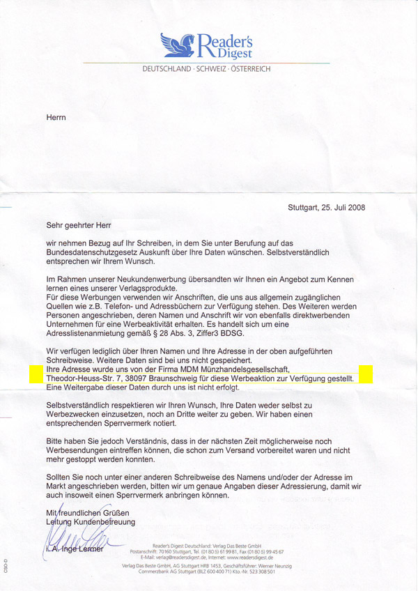 viel besser war allerdings das ich im letzten Sommer auf einmal massive Werbepost für Abo´s vom Readers Digest Verlag bekommen habe... und ich wäre eingeladen zu ihrer Veranstaltung weit weit weg irgendwo wars... ein Urlaubsangebot quasi... man musste nur den Transport löhnen oder sowas...