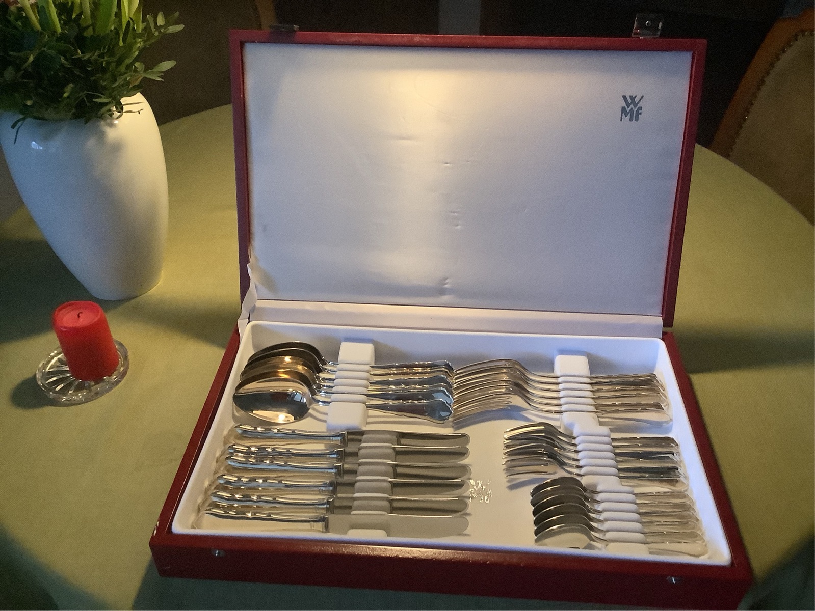 Es besteht aus jeweils 8 großen Löffeln, Gabeln und Messern sowie jeweils 6 Kuchengabeln und kleinen Löffeln.