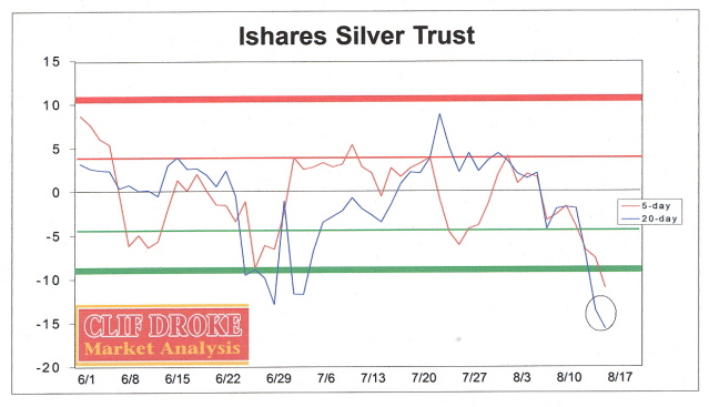 The white metal was particularly hit hard hit last week as hedge funds were selling heavily on Thursday to meet redemptions. Yet I view this from a contrarian angle and see the decline was overdone. Hedge fund managers can be just as inept as the average, inexperienced small investor and this appears to be one of those times. The Ishares Silver Trust ETF (SLV) which essentially tracks the silver price closed at $115 on Tuesday, a low for the year-to-date. Yes this is painful to consider but the SLV, as well as physical silver, is coming off a major oversold reading in the price oscillators. Take a look at the 5-day and 20-day price oscillators for the SLV shown below. Both lines have fallen below the green line which has always indicated a speculative buying opportunity in the past. Both the 5-day and 20-day oscillators are also at their greatest oversold readings of the year. The last time we saw readings like these was in late June/early July and it was followed eventually by a rally that took SLV from approximately $122 to almost $135, i.e., back up to the 200-day moving average.