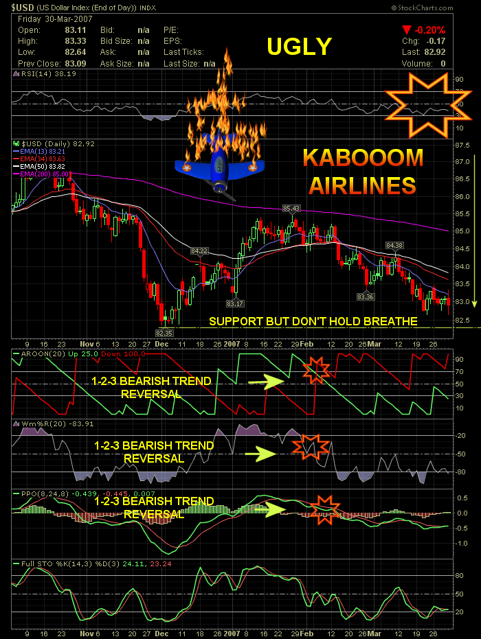 If you have been following the dollar's miseries, as I have suggested repeatedly, Friday you noticed that "they" let it slip beneath 82.0 this past Friday. This, after letting it slide beneath 83.0 just three weeks ago, though they promptly drew a new line in the dirt at 83.0. This, after letting it pancake downward like a World Trade Center implosion, always shoring it up for a time at nice, round numbers like 85.0, then floor 84.0, then floor 83.0. Friday always has been the day they pushed the dollar back up, so that the figures could be staring us in the face all weekend, while the markets were closed.