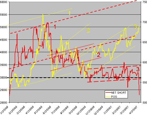 There is just one, single thing of importance that literally jumps off the page: Goldman's short position has traveled essentially sideways since gold's most recent takedown in late summer of last year, but suddenly has dropped like a rock (someday we likely will be saying, concerning a failing investment, that "it dropped like a dollar").