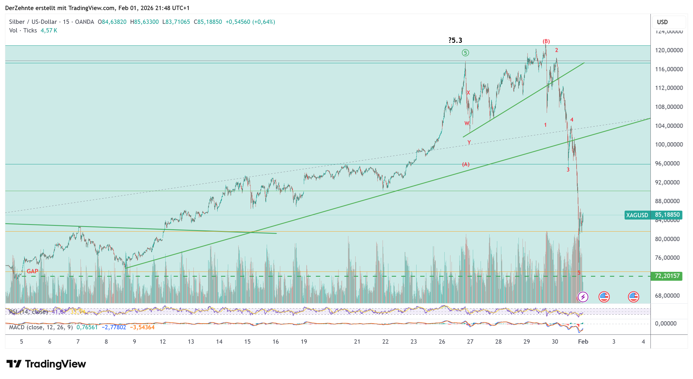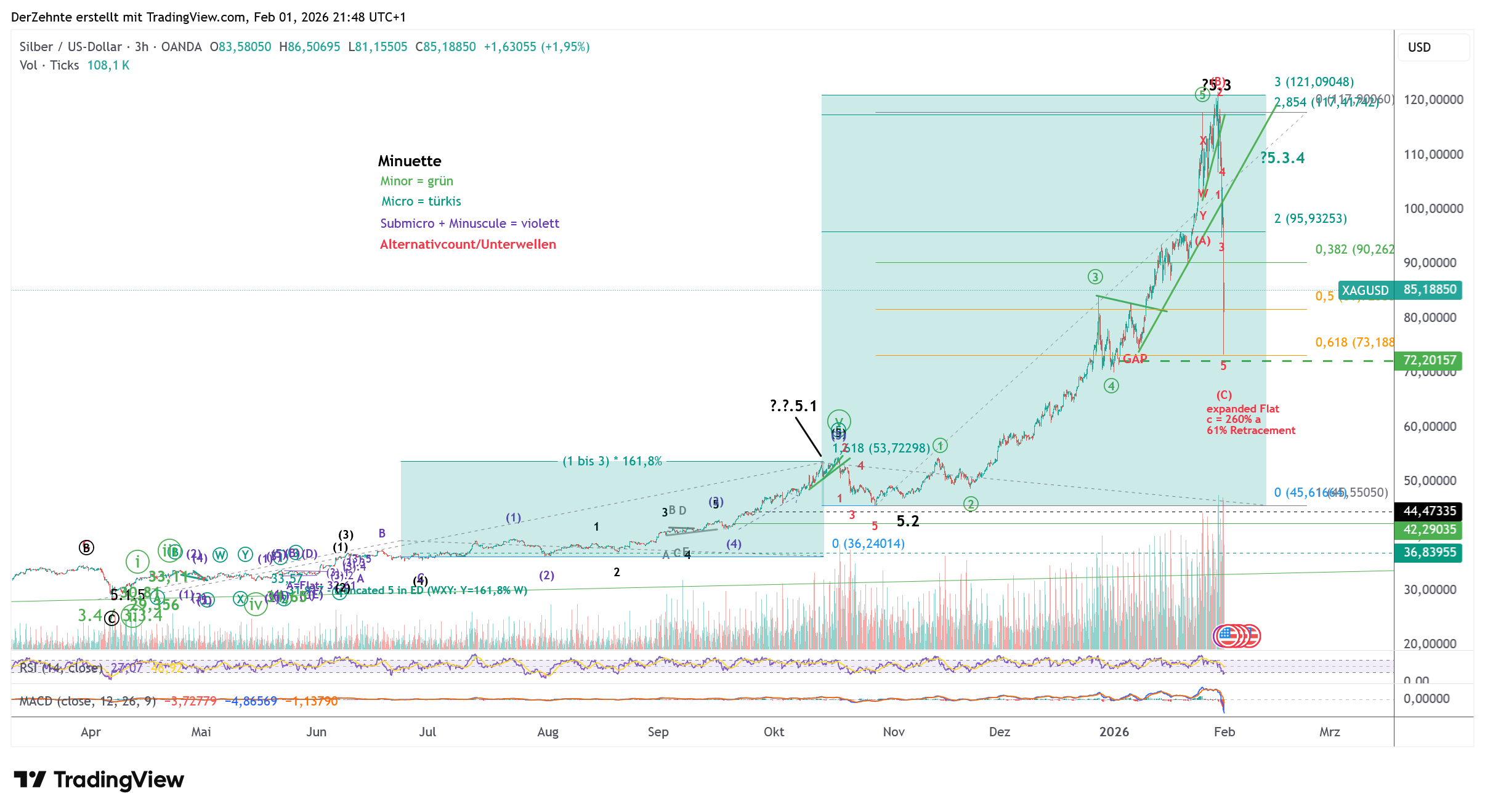 Rückblickend war wohl das Durchbrechen der 50 USD erst der Anfang und in meiner Zählung eine Welle ?.5.1 in der laufenden ?.5. Darauf folgte eine Verteidung des 50er Bereichs in Form eines expanded Flat mit typischerweise stark expadierter Welle ?.5.3. im Anschluss auf aus meiner Sicht bis 117,75. Der letzte überlappende Anstieg war bereits Teil der Korrektur in Form des rot eingezeichneten expanded Flats mit Freitagstief am 30.1.2026 bei 73,30 USD (62% Korrektur der 3). Die Abwärtsbewegung ist fünfteilig und hat den Markt bereinigt ausgelöst durch erzwungene Regeländerungen und manipulative Orders, wobei sich shortseller-Banken nun mit einem blauen Auge rauslösen konnten. Vermute nun sind JPM & Co nicht mehr Short! Kurzfristig wird es für viele nun nach einem unklaren Bild aussehen, wobei ich die Korrektur in der Tiefe der Welle ?5.4. abgeschlossen sehe und die Zeit tickt sowie der Treibstoff für eine noch folgende Welle 5 heuer bereits da ist. Mich hats auch leicht mit Derivaten erwischt, da ich dies nur rückblickend erkennen konnte. Erwarte jedoch noch höhere Kurse bis zum Sommer im Bereich 140+ USD/Unze, wohingegen ich bei Gold meine, dass das Top schon drinnen ist für einige Monate. Also während Gold eventuelle eine Gegenbewegung macht, erwarte ich bei Silber neue Hochs.Alternativ: Falls es sich mit den Lagerbeständen/Manipulation noch ausgeht ist mein Alterantivszenario die Ausbildung einer verengenden Preisrange zwischen 117 und 73 USD als Triangle über die nächsten 1 bis 30! Monate wie 1974-1976/77, vermute dies aber erst später in Folge eines Ölpreisanstiegs & Aktieneinbruchs.