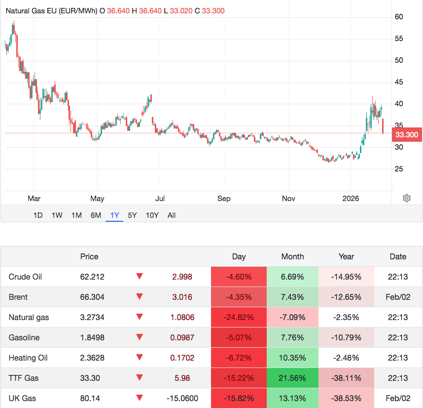 Die Erwähnung der Rekord-Short-Positionen bezieht sich auf die Phase Anfang Januar 2026, als spekulative Akteure massiv auf fallende Preise setzten (teils wurden Netto-Short-Rekorde von über 11 TWh in Berichten wie dem US-COT für TTF-Äquivalente oder ähnlichen Metriken genannt).