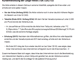 In LGO war ich vor Jahren schon mal drin und gerade so wieder rausgekommen.Das Arias wieder kauft, ist ein gutes Zeichen. Das letzte Mal in der Not war aber nicht beim ersten Insiderkauf das Tief und er hat richtig viel Geld gegeben und sich tonnenweise Warrants geben lassen.